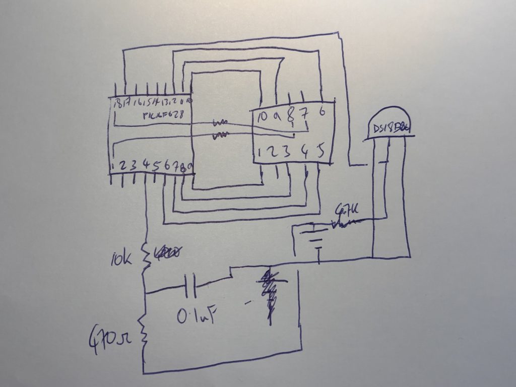 Use this hex code file to flash the PIC16F628 chip, any programer will do. Then build the circuit per the schematic and parts list below, switch it on and hey presto!